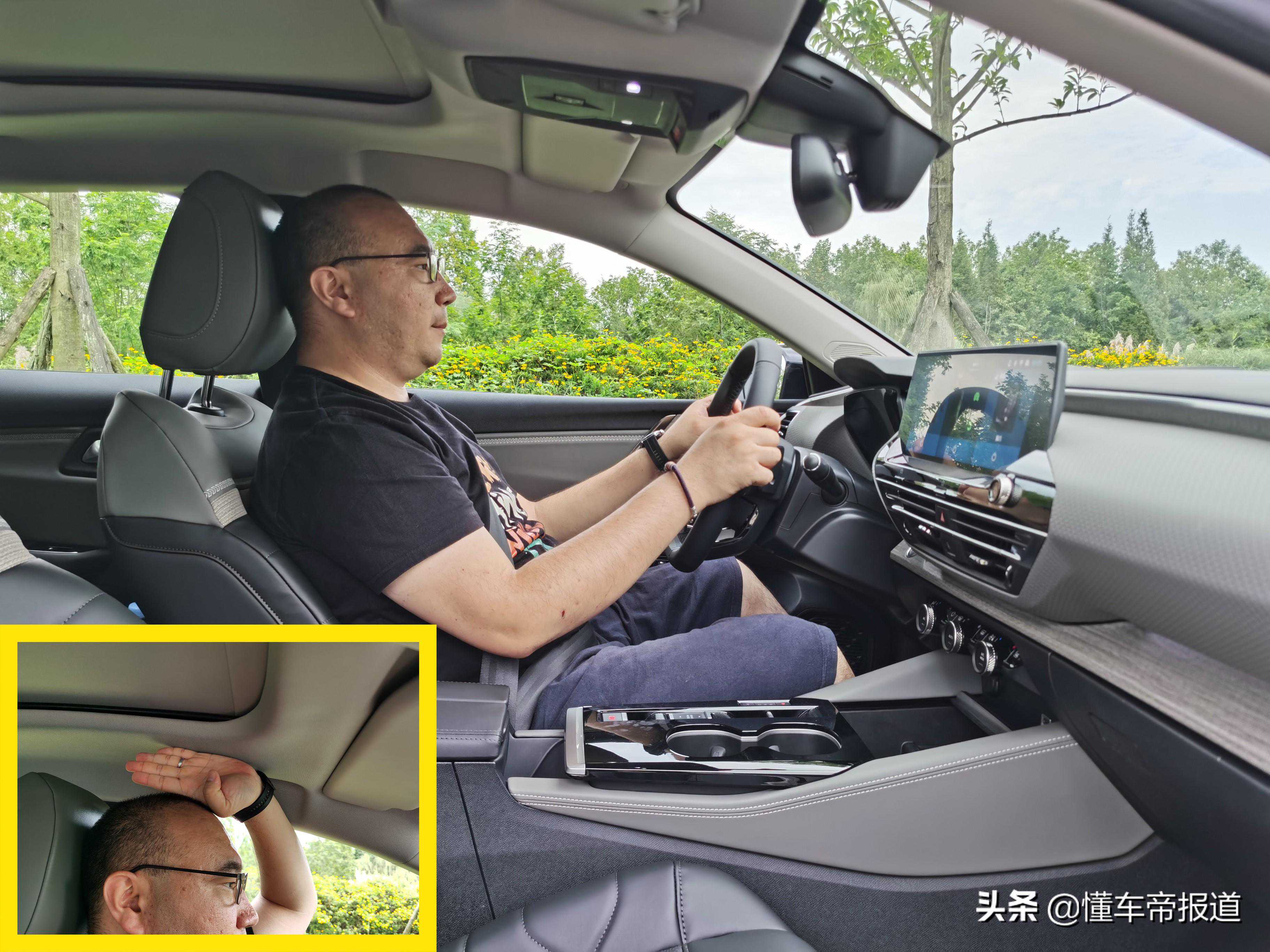 前排体验人员身高177厘米,调节到合适的驾驶位后头部留有四指左右的空间