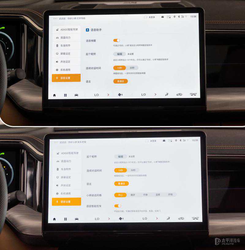 在车机界面中,下拉菜单后能够看到音量、亮度、语音等快捷功能控制,与此同时还提供了4种情景模式,包括了休息模式、暴雨模式、醒神模式、派对模式,通过智能化控制,满足更多的需求。