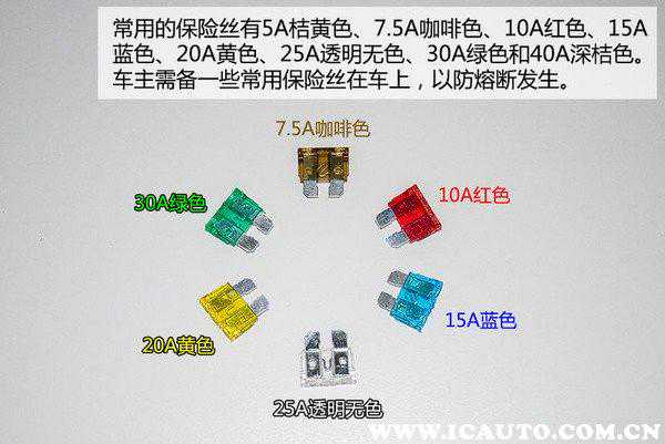 保险丝也有两种不同类型,一种是片状保险丝,较细,插入式,允许电路通过电流为5~25A;另外一种是慢熔保险丝,方型,插入式,允许电路通过电流为20~60A,颜色代表保险丝的安培数,根据颜色的不同,可以很清楚的区分不同安培数的大小,该安培数也标注在保险丝上。