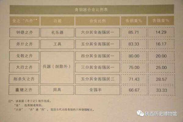 在《考工记》中记载:“金有六齐:六分其金而锡居一,谓之钟鼎之齐;五分其金而锡居一,谓之斧斤之齐;四分其金而锡居一,谓之戈戟之齐;三分其金而锡居一,谓之大刃之齐,五分其金而锡居二,谓之削杀矢之齐;金锡半,谓之鉴燧之齐”。这是我国乃至世界上已知有关青铜合金成分规律最早的记载。这里的“金”指的就是铜或者铜合金。