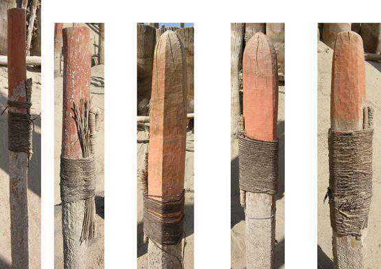 依墓主性别的不同,墓葬棺前立木形制不同。女性墓前会摆放涂红的男根立木,男性墓葬前立有涂黑的女阴立木。木棺呈独木舟形,用胡杨木制作而成,由侧板、挡板、盖板组成,无底。每座木棺上至少盖有三张牛皮,我们推测是在墓地附近将牛宰杀后,直接取新鲜牛皮蒙盖于棺上,这样牛皮干了之后才会紧紧地箍在木棺上。