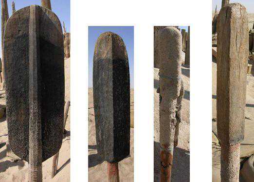 在墓地沙丘东部,我们还发现大量构成太阳墓的尖木桩,推测在墓地中也存在有该类墓葬。