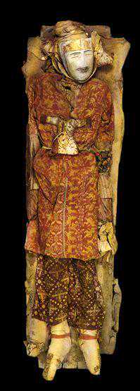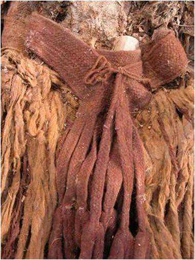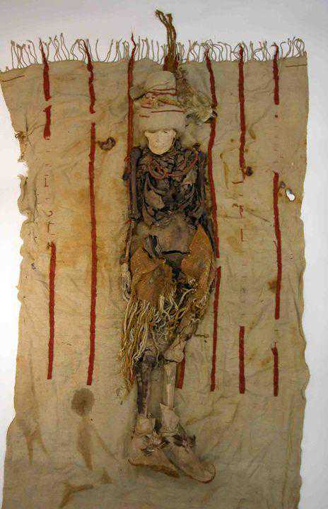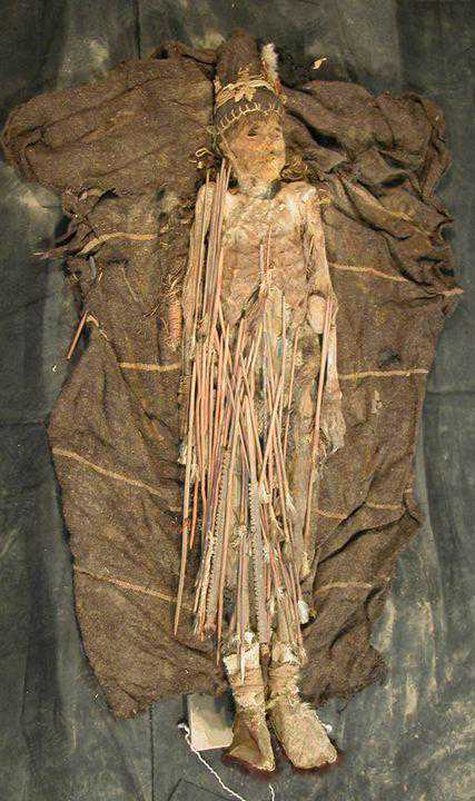 木棺内的墓主直接躺在沙地上,头戴装饰伶鼬的毡帽,身上裹着斗篷,除内穿一件腰衣外,没有其它衣服。每人身体右侧均放置一件草篓,里面装着粮食种子。