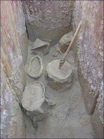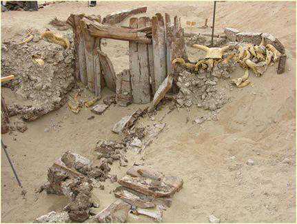 泥壳木棺墓总共发现了四座,在墓葬的周围,栽立有多根变径木柱,上面捆绑有涂红色的牛头,这些牛头已在外暴晒了4000年,很多已经风化、脱落了。