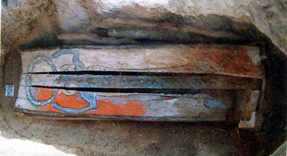 厢式木棺多呈四足式,有的外壁有彩绘。独木棺墓口用木柱封门,木棺由大树掏挖而成,有的是把独木棺扣在墓主身上,有的是把墓主人直接放在独木棺内。