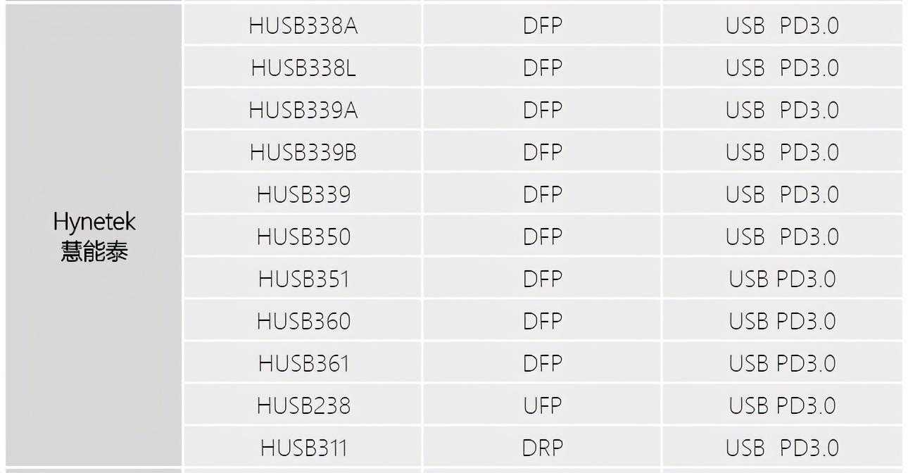 目前慧能泰已经推出了PDSource协议芯片HUSB338A、HUSB338L、HUSB339A、HUSB339B、HUSB339、HUSB350、HUSB351、HUSB360;PDSink协议芯片HUSB238;PDPHY协议芯片HUSB311;eMarker芯片HUSB330、HUSB331、HUSB332、HUSB332A;负载开关芯片:HUSB304、HUSB305。