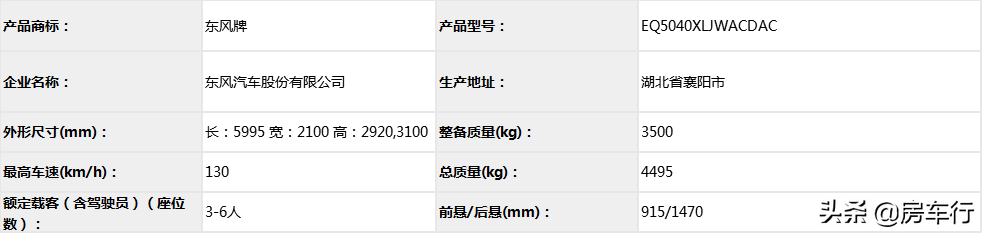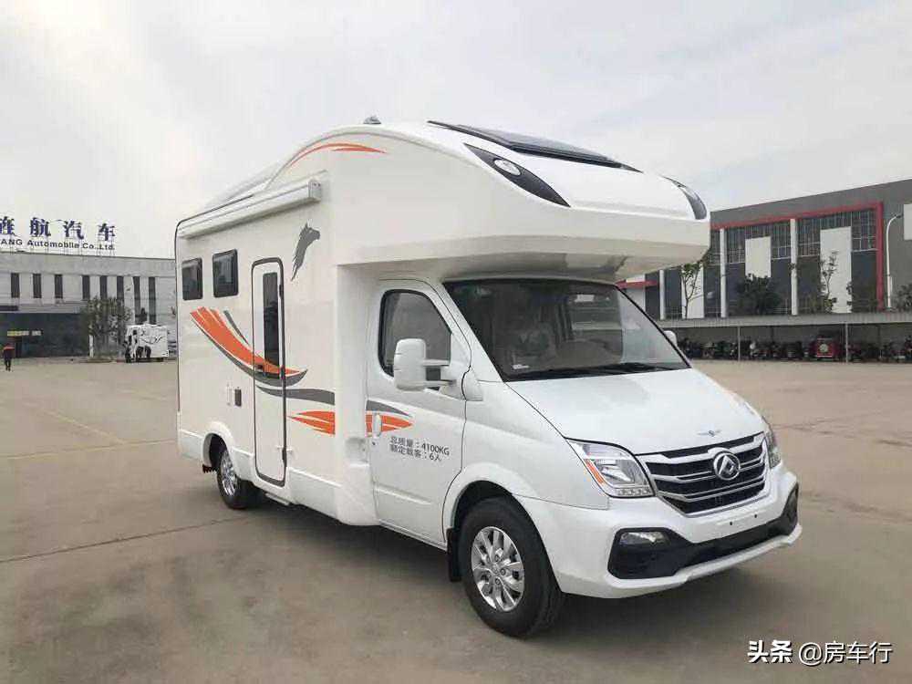 随底盘选装轮辋样式,低顶,前脸,侧拉窗,后视镜,侧拉门踏板,尾部标识,车顶选装行李架,太阳能板,空调,换气扇,卫星天线,选装改装后单侧或双侧拉门踏板,侧拉门可选装电动踏步.车身两侧后侧窗选装盲窗,乘坐区两侧车窗可选装粘贴式推拉窗,车身选装遮阳蓬,外置淋浴,注水口,外接电源充电接口,输出插座以及行李舱门,选装车辆尾门爬梯,自行车架,选装车身四周大包围.对应前悬/后悬1130mm/1290座车辆整备质量2580Kg;3-4座车辆整备质量2720Kg;5-6座车辆整备质量2860Kg.车辆配备液晶显示屏,微波炉,洗手池,冰箱,卧具等旅居生活设施和娱乐设施.车身粘贴备案样式彩条.ABS系统控制器型号:EV5051,生产厂:博世汽车部件(苏州)有限公司,发动机最大净功率:147kW.