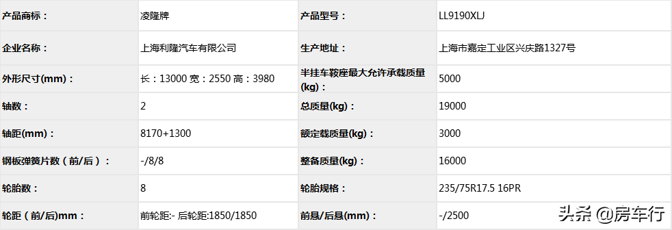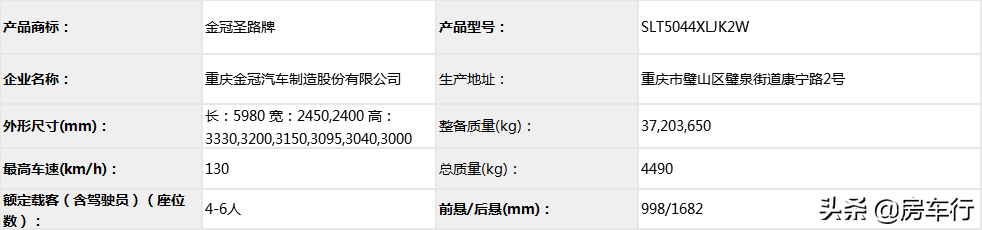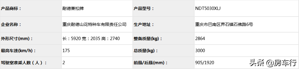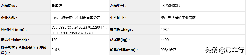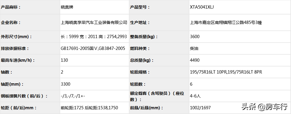 安装重型床铺时整备质量为2684kg,对应最大额定载客2人;安装厚型床铺时整备质量为2548kg,对应最大额定载客4人;安装普通床铺时整备质量为2480kg,对应最大额定载客5人;配备床铺,餐桌,电视,冰箱,炊具,淋浴,卫生间,可选装太阳能板,卫星天线,空调,排气扇等房车专用装置,上下水系统等旅居生活设施和娱乐设施;当选装自救装置和防护装置时其整车长度为5800mm,其整车高度尺寸为2405mm;ABS型号:V3G-N,ABS生产厂:DENSOCOPORATIONDaianPlant;发动机最大净功率为130(kw).