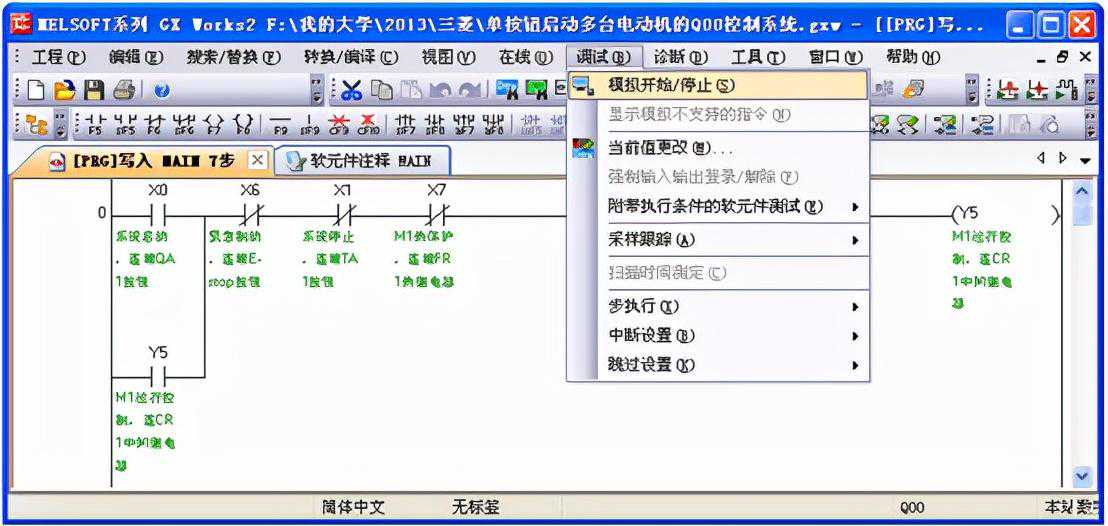 三菱GXWorks2编程软件中集成了仿真的功能,仿真时单击【调试】下的【模拟开始/停止(S)】就能进入程序的仿真操作了,调试的子菜单如图1所示。