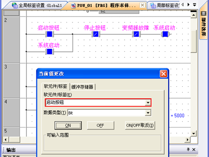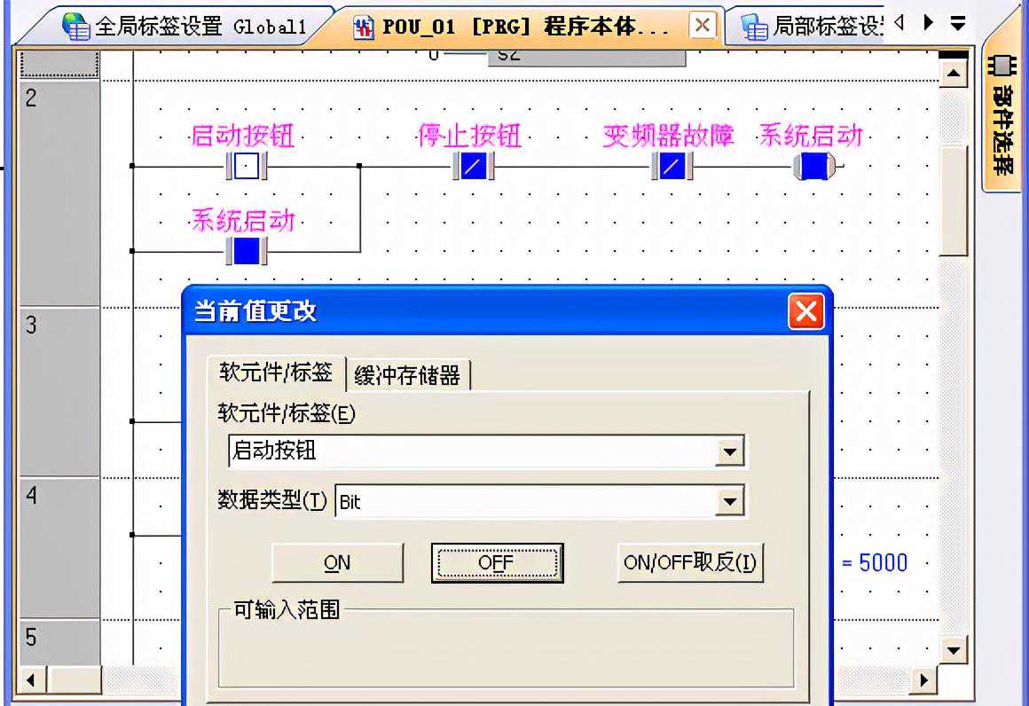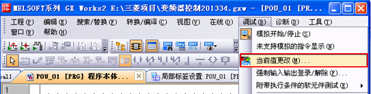 在调试程序时,为了方便调试,笔者要对简单的变量进行修改,可以使用菜单栏【调试】下的【当前值修改】功能,此功能能实现对全局标签和局部标签的当前值进行修改,用于模拟现场的运行条件,来观察程序在运行条件满足时是否按工艺要求运行,可以通过此功能模拟现场的运行过程,这样可以提前发现程序中有可能存在的逻辑错误,缩短在现场调试的时间,当前值修改的菜单位置如图4所示。