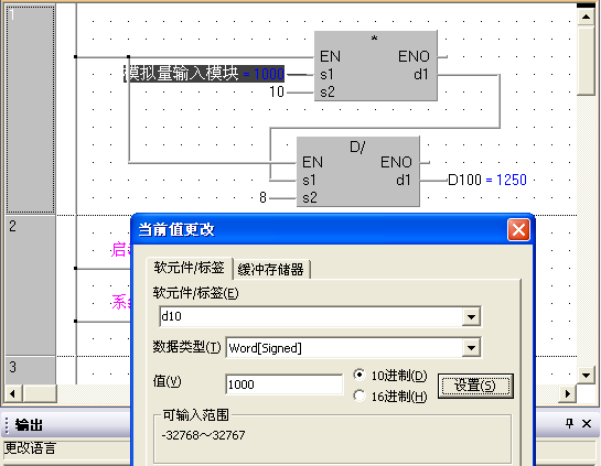 下面说明在本例中对当前值修改的使用,在当前值修改对话框中,要修改的软元件修改为D10,(这是模拟量输入模块的全局标签对应的软元件地址),将数据类型改为word,并将值修改为1000,然后单击设置,我们可以看到D100的值由0变为1250,这与1000*10/8=1250相符,这个结果如图5所示,为保证功能正确,可以将D10的值改为40,我们会看到D100的值相应变为50,说明梯形图块1的编程是正确的。
