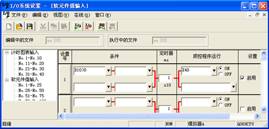 除了当前值修改这个有力的调试工具外,GXWorks2同时也提供了类似GXDeveloper编程软件中的变量值根据条件进行修改的功能,方法是在GXSimulator2对话框中-工具-IO系统配置,IO系统设置对话框如图8所示。