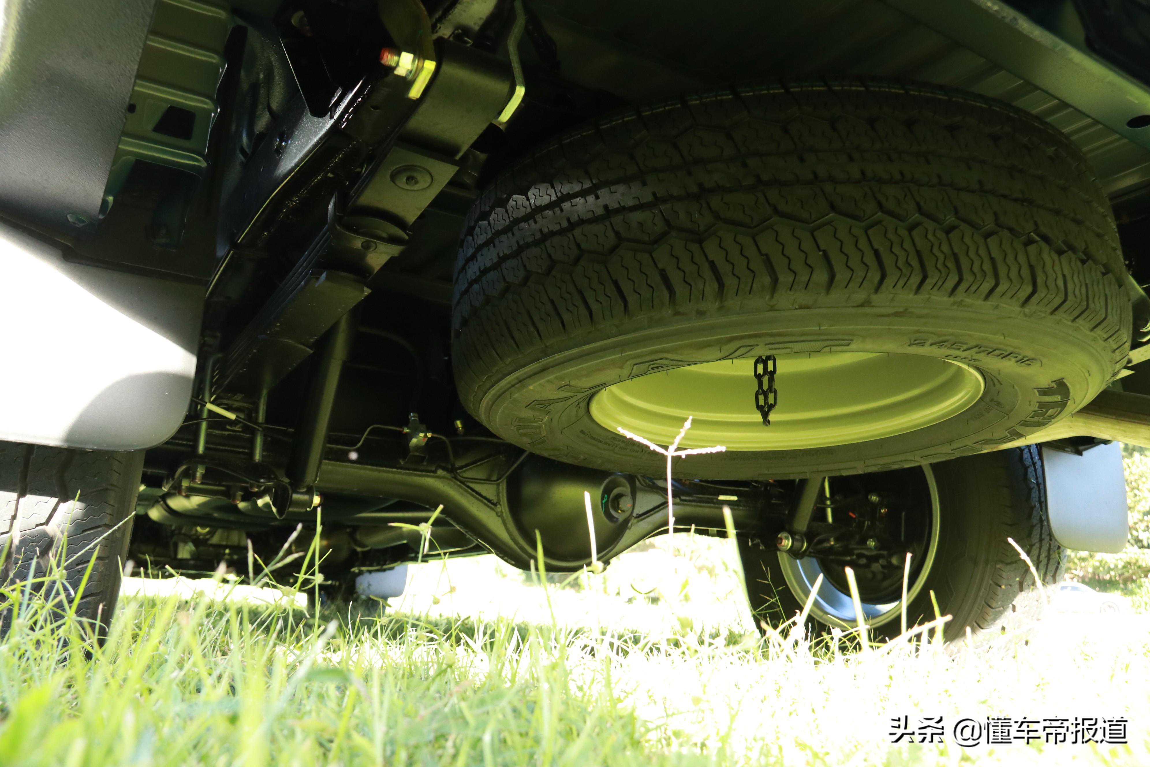 车身侧面并没有太多复杂的设计线条,经过镀铬装饰点缀的车门把手是为数不多的反光件,看起来倒是比较精致。我们试驾的长轴距版车型配备了原厂的龙门架,为货厢内装点货物提供了额外帮助。轮胎方面尺寸达到245/70R16,较厚的胎壁为舒适的驾驶感受打下了基础。