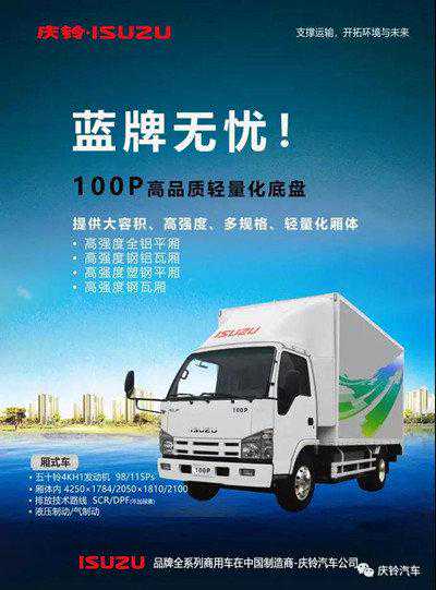 100P作为高端窄体轻卡的标杆产品,庆铃五十铃100P轻卡升级后,采用性能更优的五十铃4K动力,取代了4JB1发动机,动力提升到115马力,车辆动力、装载能力有了进一步提升,能够满足城市物流用户的需求。