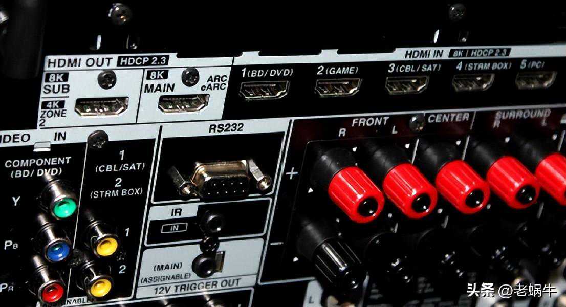 中部区域主要是喇叭接线柱,按上面名称连接对应声道音箱就可以了。左侧还有一些光纤、同轴等接口,以及智能中控对接用的RS232接口、联动触发接口,普通客厅影院用户基本用不到,可以无视。
