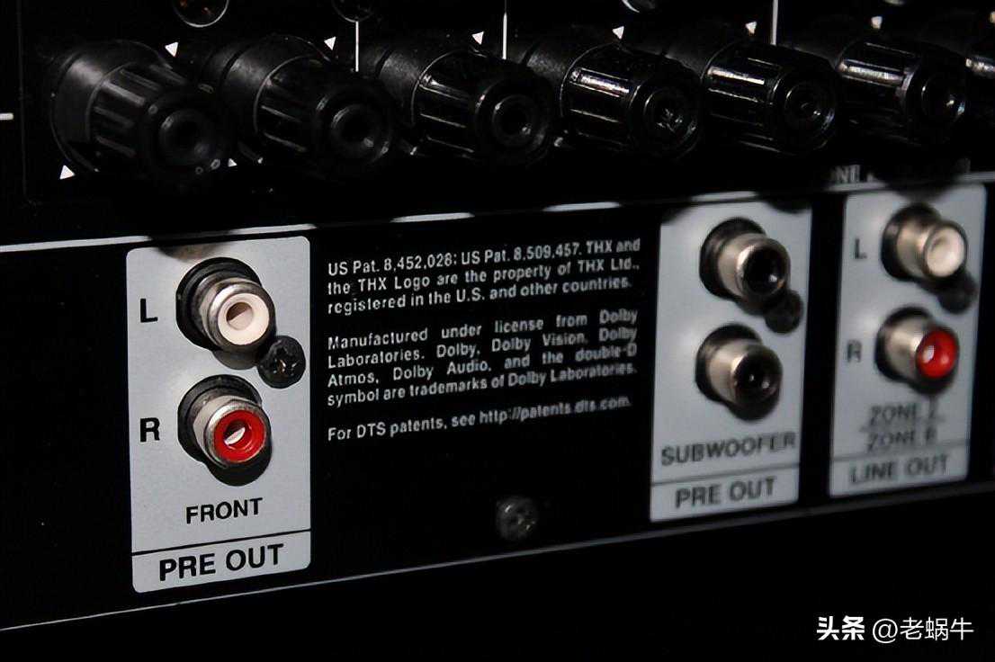 下部区域左侧主要是模拟输入通道,可以用来接CD机等信号源;下部右侧是模拟输出通道,包括一定会用到的有源低音炮接口,以及听立体声音乐有可能用到的左右声道前级输出接口(音乐发烧友可以另外搭配一台高素质立体声后级功放),还有一对可能永远都用不到的多分区音乐输出接口。