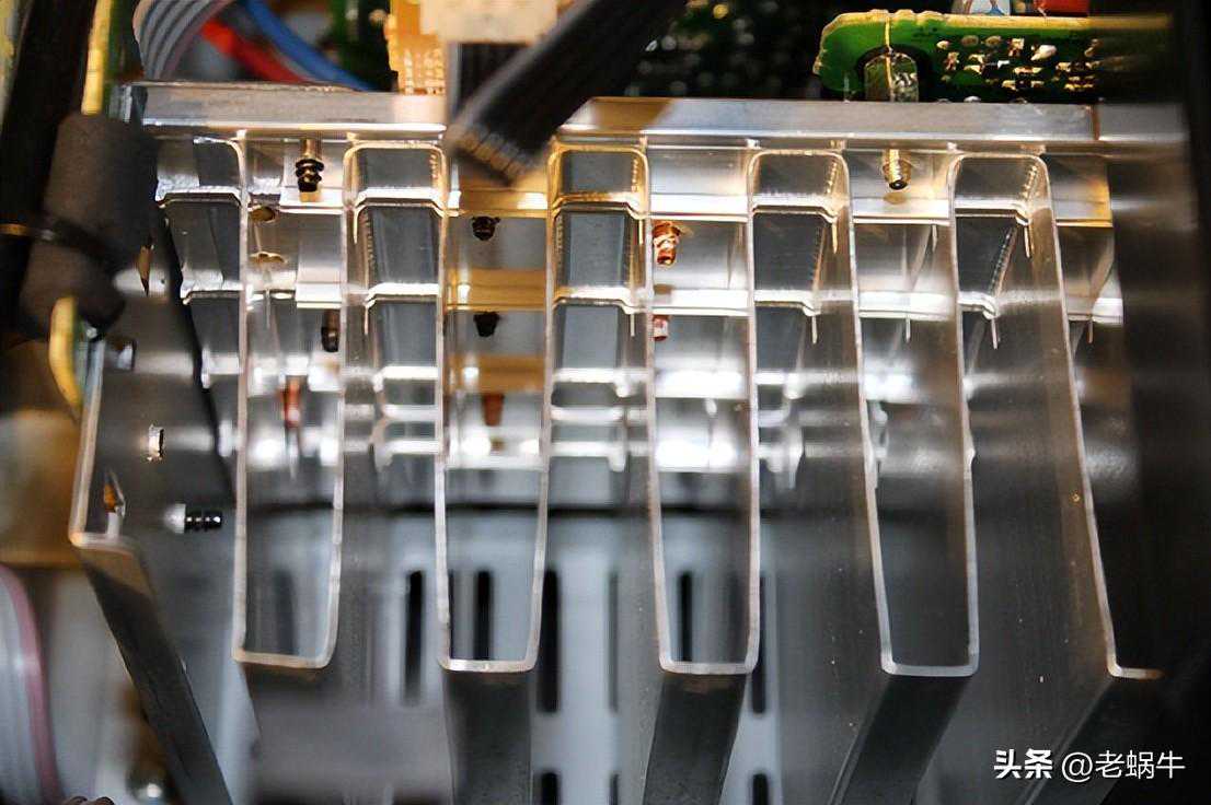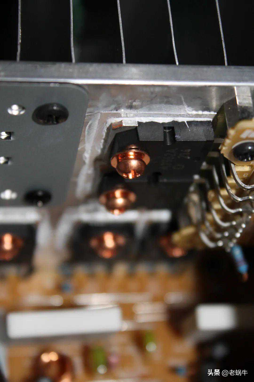 TX-NR7100功放每声道使用一对2SA1962A/2SC5242A推挽输出,功放电路配备了两只10,000μF滤波电容,可以实现每声道220W(6欧姆,1kHz,10%THD,单声道驱动)功率输出。