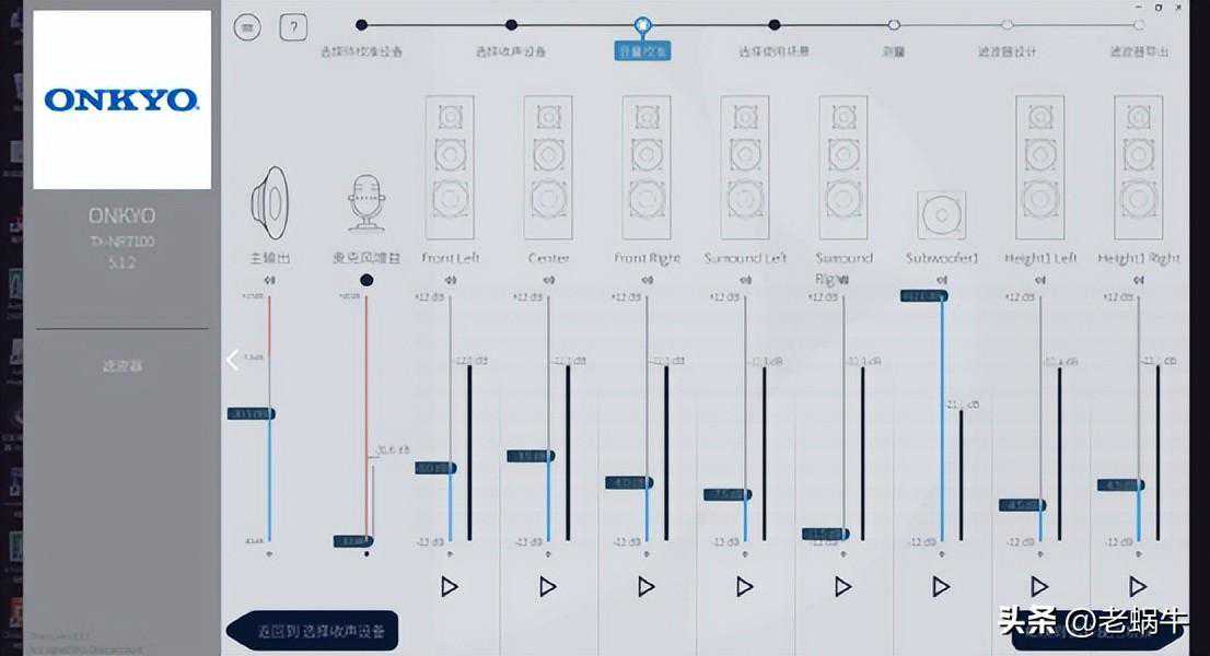 音量校准是新手最容易发蒙的地方,首先左边主输出就是功放音量,不宜调太高,也不能太低,需要根据具体环境和设备来边试边调(让右边所有声道电平都调整到-12dB)。