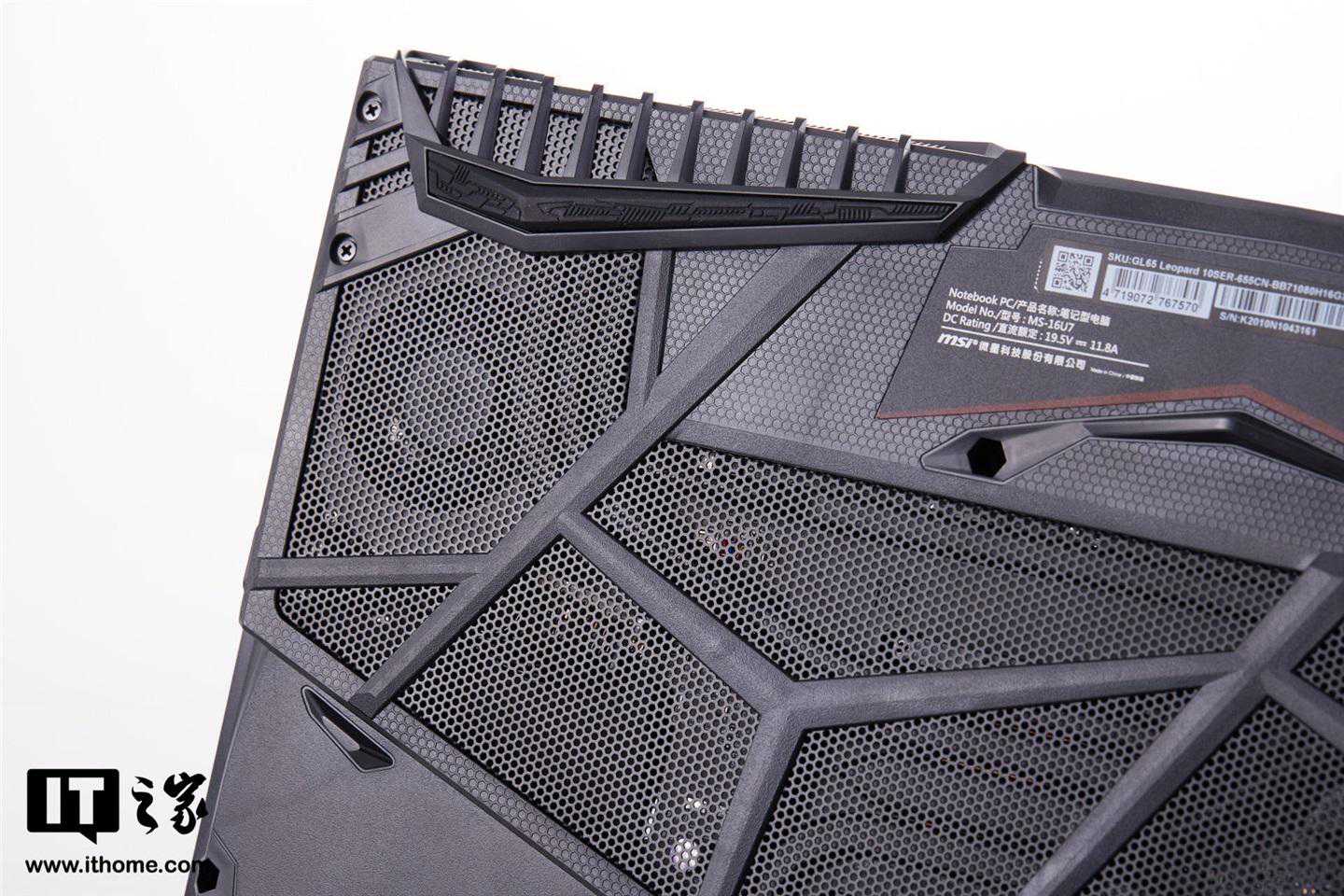 散热方面,冲锋坦克2GL65采用了双风扇和三出风口设计,风扇位于底部的两侧,出风口位于机身左上侧和后侧,同时搭配了7根导热管,对比同级别的游戏本散热配备,这一点可以说是很良心了。