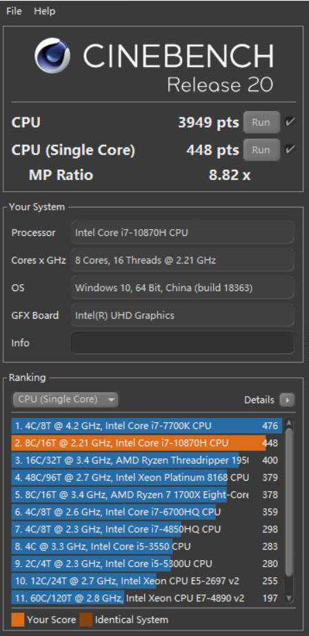 相较于上半年的i7-10750H,i7-10870H的升级幅度还是非常之大,从跑分数据来看的话,i7-10870H差不多有20%的领先性能。简单总结,i7-10870H相比i7-10750H增加了2个物理核心,最高睿频又比上半年推出的i7-10875H低0.1GHz,是一款加量不加价的好U。