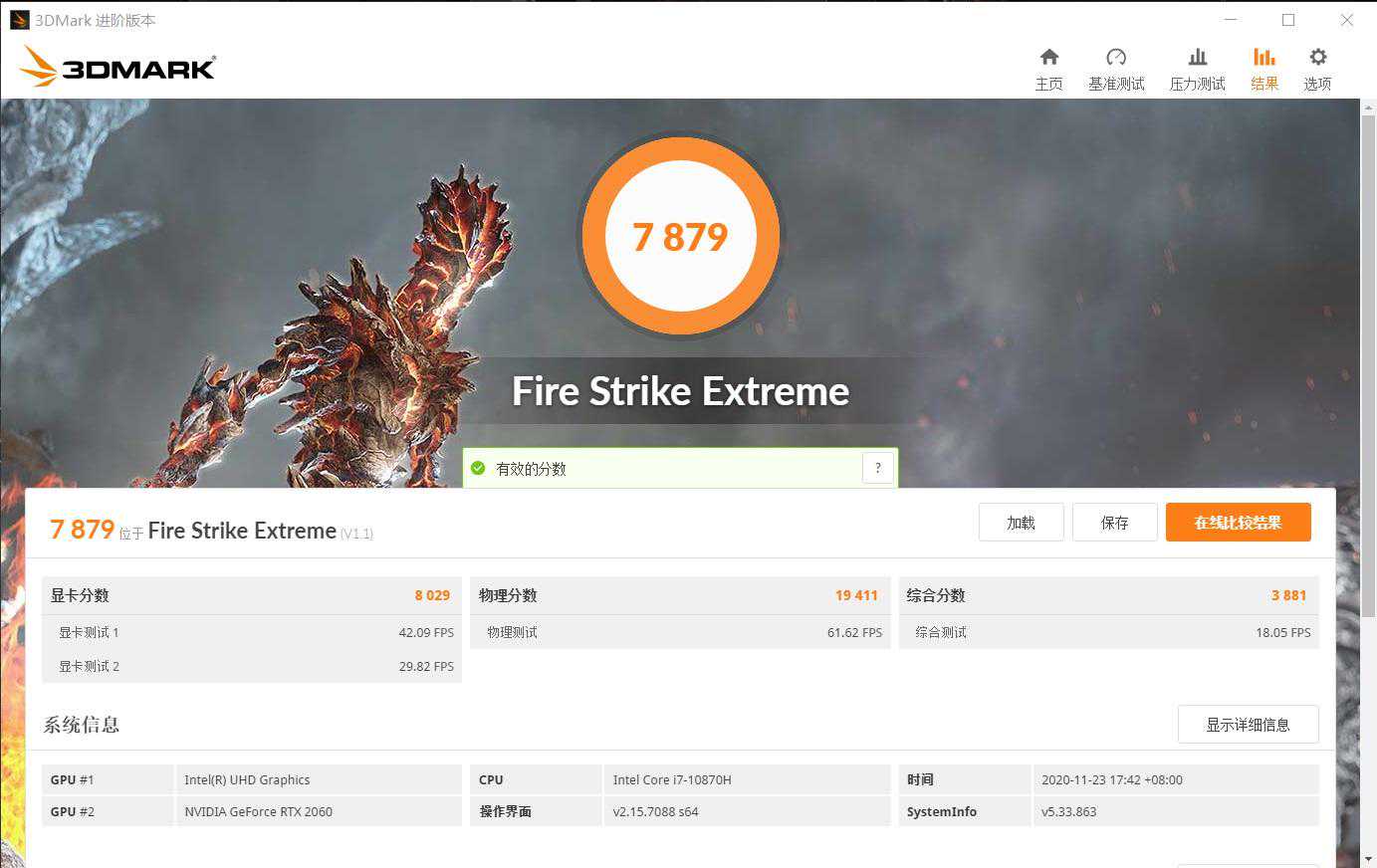 FireStrikeExtreme中,冲锋坦克2GL65显卡分数为8029,物理分数为19411,总分7879。