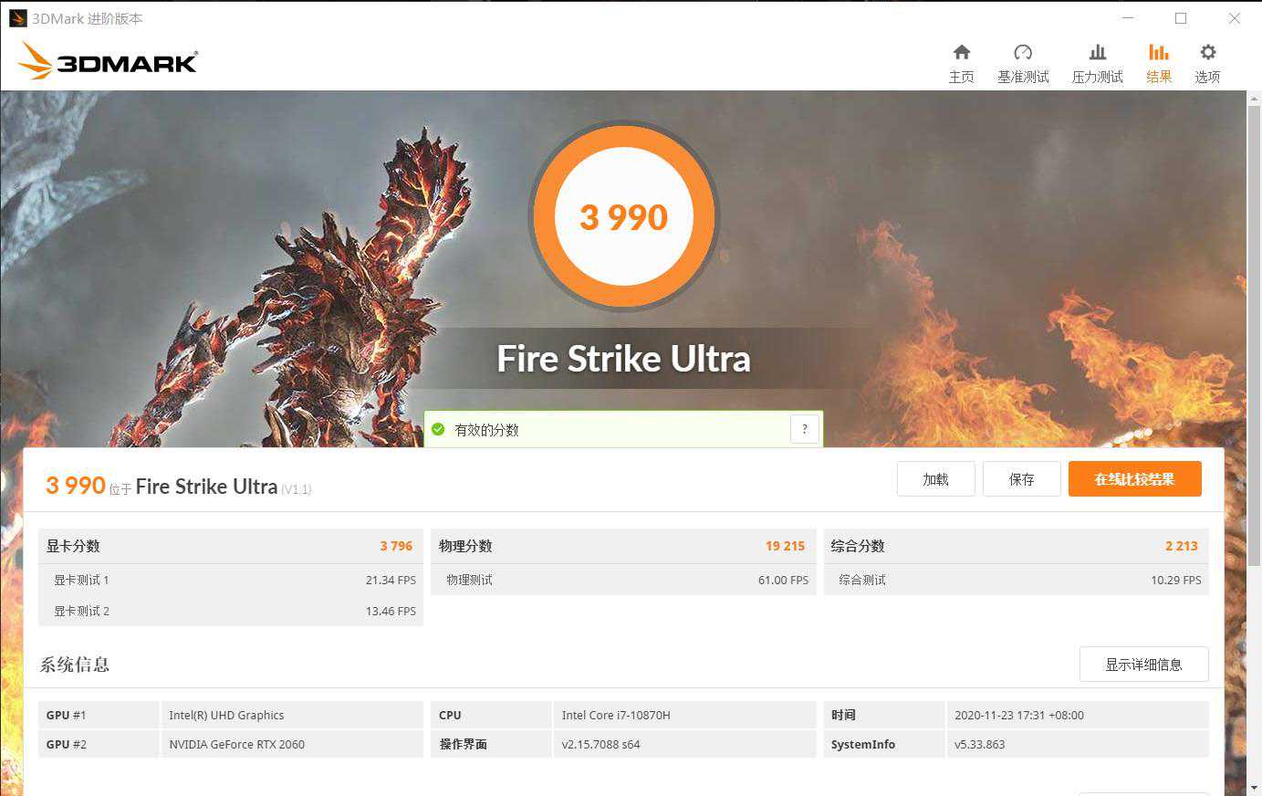 FireStrikeUltra中,冲锋坦克2GL65显卡分数为3796,物理分数为19215,总分3990。
