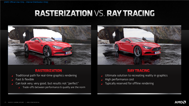 这是AMD放出的RNA2光追渲染效果图,可以看到RDNA2实时光线追踪效果与传统光栅化渲染的差别。