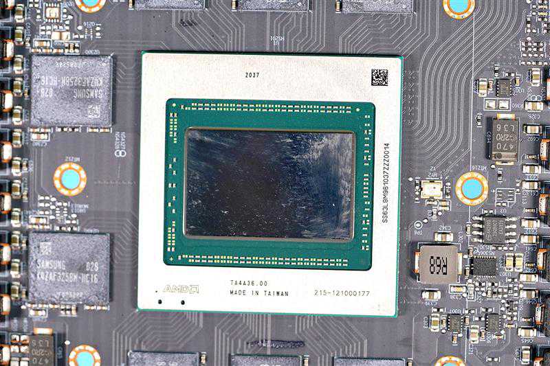 旁边是三星GDDR6显存颗粒,频率16GHz,单颗容量2GB,一共8颗组成256Bit16GB,显存带宽达到了512GB/s。
