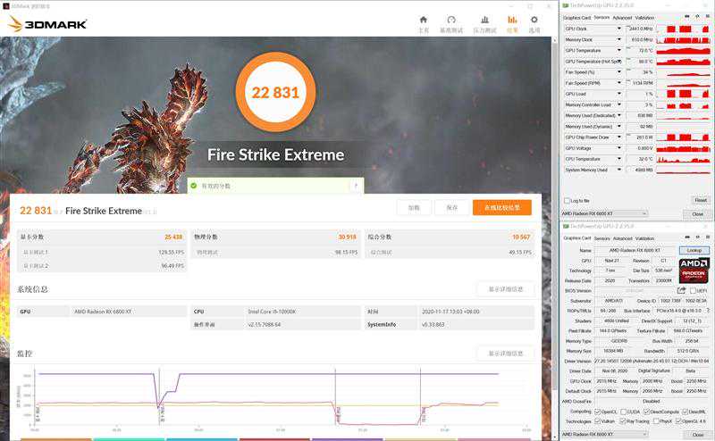 在2K分辨率3DMarkFireStrikeExtreme测试中,RX6800XT的图形分数达到了25438分,核心温度最高72℃,核心运行最高频率为2441MHz,显卡最大功耗达到了281W。