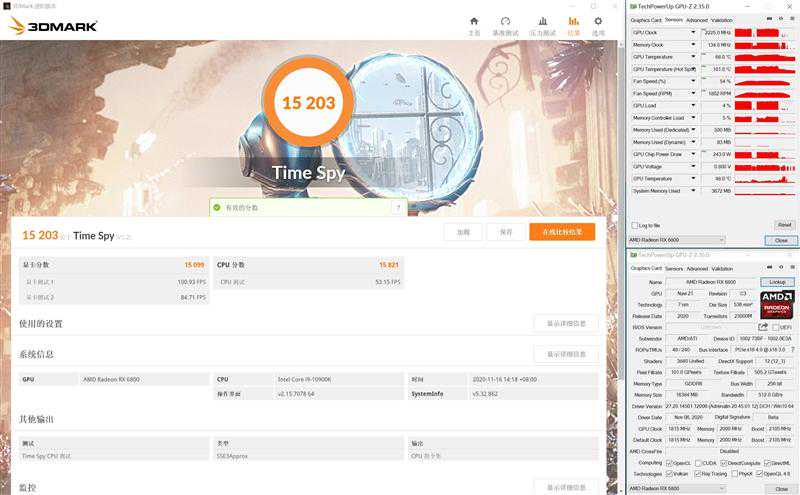 在2K分辨率3DMarkTimeSpy测试中,RX6800图形分数达到了15099分,核心温度最高68℃,核心运行最高频率为2225MHz,显卡最大功耗达到了243W。
