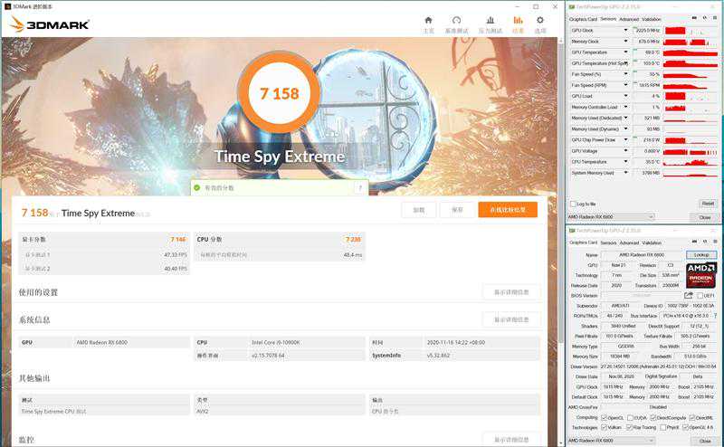 在4K分辨率3DMarkTimeSpyExtreme测试中,RX6800图形分数为7146分,核心温度最高69℃,核心运行最高频率为2225MHz,显卡最大功耗达到了218W。