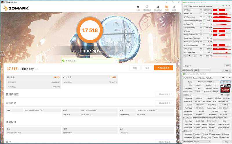 接下来是RX6800XT!在2K分辨率3DMarkTimeSpy测试中,RX6800XT图形分数达到了17871分,核心温度最高74℃,核心运行最高频率为2313MHz,显卡最大功耗达到了265W。
