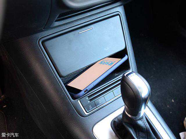 挡把前方的储物槽刚好可以放下一台iPhone7Plus,上方盖板中还配有12V点烟器接口,方便取电。