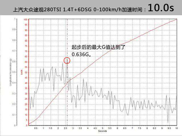 在进行加速测试的过程中,ESP的开启和关闭对加速成绩影响还是非常明显的。由于DSG变速箱的保护程序并不允许进行弹射起步,在松开刹车后,变速箱经过半秒左右的迟疑后,义无反顾的将整个车身推出。最终0-100km/h加速时间为10s整。