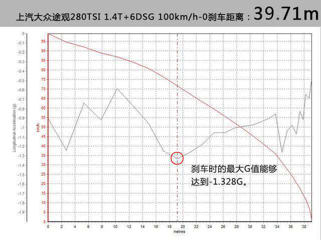 在刹车的测试过程中,整体表现可以令人满意,悬挂可以很好的抑制重心偏移,轮胎的纵向摩擦力表现良好,最终100km/h-0的刹车距离为39.71m。