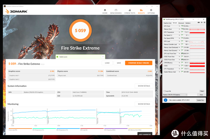 额好吧。即便是室温22°C的情况下,这个烤机温度表现,确实不错。¥309块钱买到这样体质和性能的RX570,装个驱动补丁也是可以接受的。然后,看看残血版RX580的表现如何吧: