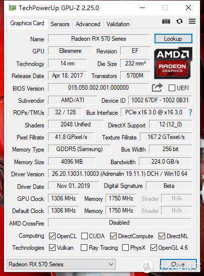 1306MHz的主频,在RX570界也算高的了,驱动版本19.11.1