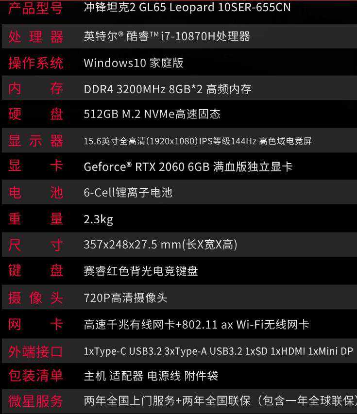 IT之家拿到的这款微星冲锋坦克2GL65(具体型号为GL65Leopard10SER-655CN),搭载了i7-10870H处理器,16GB内存,512GBSSD以及RTX2060显卡和144Hz高色域屏幕。目前京东优惠后售价为8499元,价格优势还是相当明显的。