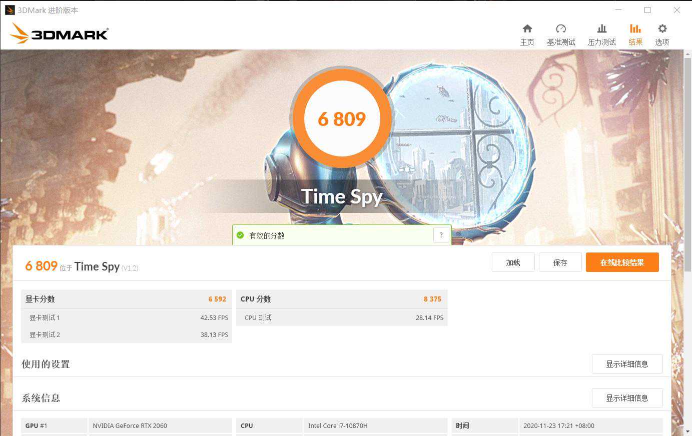 4、显卡测试接着是显卡跑分测试,在3DMark的TimeSpy中,冲锋坦克2GL65显卡分数为6592,CPU分数(物理分)为8375,总分6809。