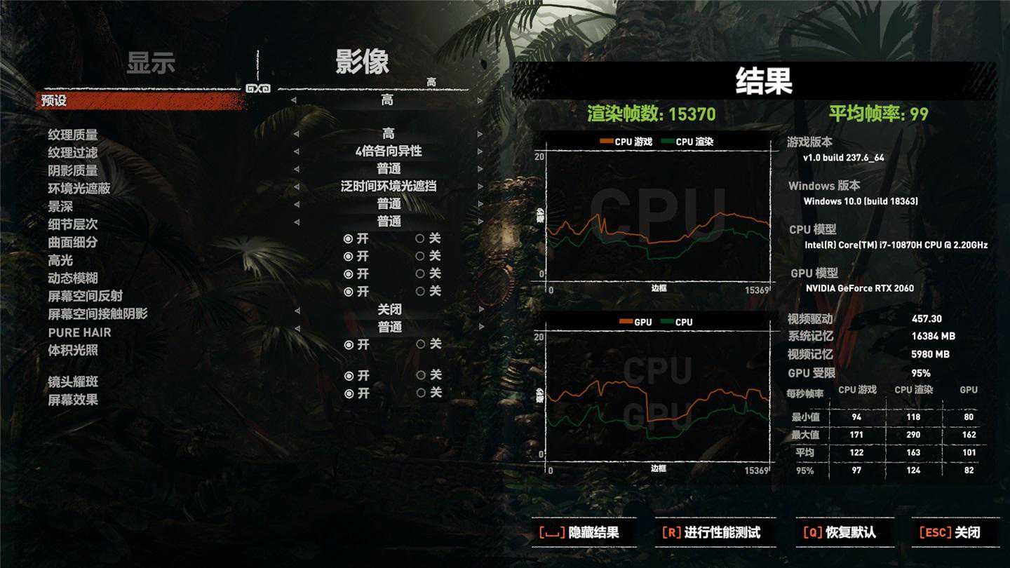 接下来是《古墓丽影:暗影》,默认画质下,冲锋坦克2GL65平均帧率可跑到99fps,几乎达到100FPS,表现出色,令人满意。