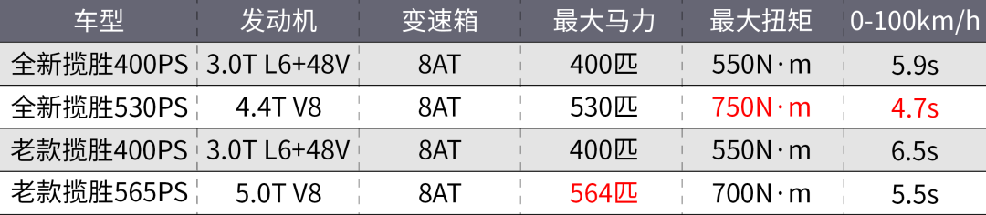 动力方面,全新一代揽胜的六缸车型与老款相比没有变化,依然是捷豹路虎自研的3.0T直六发动机,搭配48V轻混系统。但得益于采埃孚新款8AT变速箱在传递效率、齿比方面的优化,全新揽胜3.0T车型的0-100km/h加速仅为5.9秒,比老款快了0.6秒。至于V8版本,全新一代揽胜不再使用老旧的5.0L机械增压发动机,而是换上了来自宝马的4.4TV8发动机,最大功率530马力、最大扭矩750N·m,0-100km/h仅需4.7秒,比老款V8车型快了0.8秒。