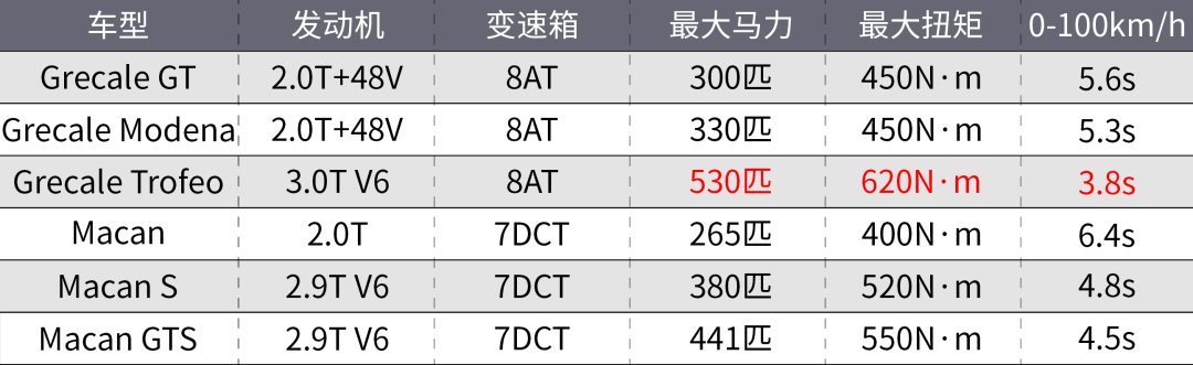 动力方面,玛莎拉蒂Grecale根据版本不同提供了两个功率的2.0T、以及一个3.0TV6动力可选。对比保时捷Macan的话,玛莎拉蒂Grecale的动力规格整体要更高一些,但售价也要比保时捷更贵。要知道,2.0T的Macan指导价为55.40万元,比Grecale便宜了接近8.5万元。而MacanGTS售价84.80万元,比GrecaleTrofeo的99.98万元足足便宜了15万。