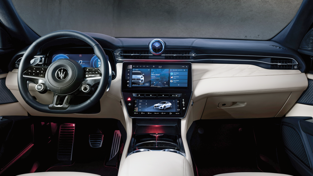 Grecale的内饰部分采用了12.3英寸全液晶仪表+12.3英寸中控屏+8.8英寸空调面板触控屏的三屏设计,但中控台依然保留了比较丰富的线条设计,给人一种传统与科技结合的视觉效果。