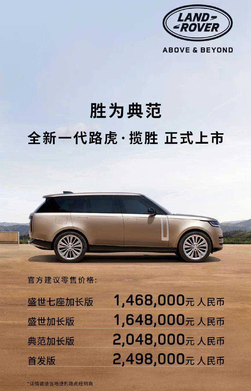 最近一段时间,车圈的目光都被全新一代宝马7系夺走了,可在高端市场,还有另外一款重磅车型在国内上市,它就是全新一代路虎揽胜。此次上市的全新一代揽胜全部为长轴版本,共包括2款动力、4款配置,售价区间146.8-249.8万元。值得一提的是,这仅仅是全新揽胜的首批上市车型,在5月底路虎还将在国内推出标轴版、顶级的SV版、以及插电混动版本。据了解,目前揽胜在4S店是需要加价大约20万才能购车的,这也意味着顶配车型落地价格将会达到300万。而我们之所以在标题说全新揽胜“只卖”146万,主要是因为上代揽胜3.0T高功率加长版,指导价已经达到了157.30万元,相当于新车还便宜了10万块!