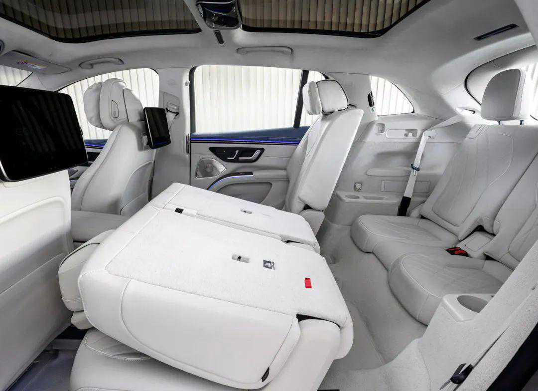在座椅布局上,毕竟EQSSUV是一辆车长超过5.1米的大型SUV,所以除了标配5座布局外,也可以加钱选装7座布局。而且官方还表示,EQSSUV在5座模式下,车辆的后备箱可以容纳4套高尔夫球杆,或者是装载24箱矿泉水。