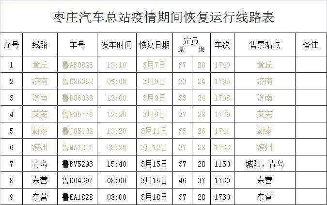 3月12日,枣庄汽车总站发布疫情期间最新恢复运行线路。据了解,目前枣庄汽车总站共有8条线路已恢复运行,3条线路已公布具体恢复日期。详细情况如下: