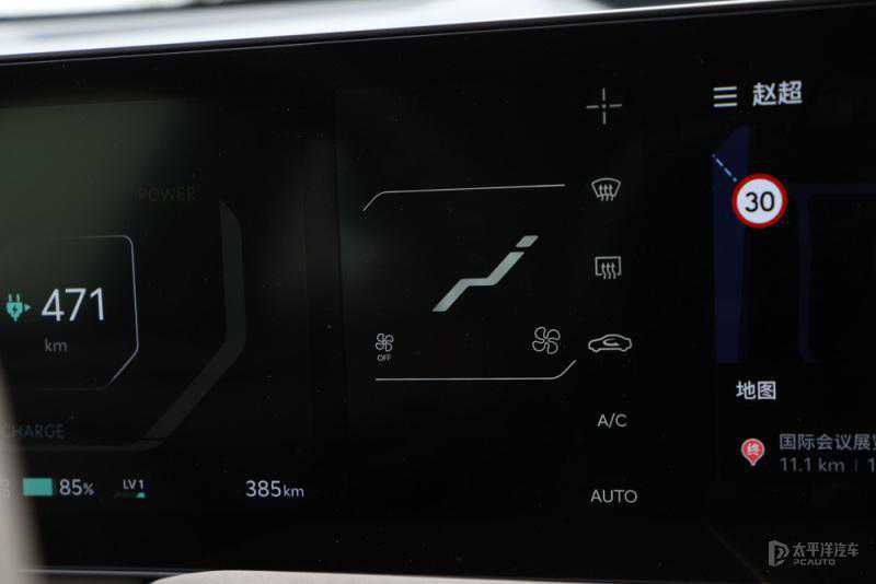 中控台采用了双12.3英寸连屏设计,加上夹在中间的空调系统显示屏,营造出三连屏的效果。仪表盘和车载系统界面分列左右两侧,分辨率较高,显示效果挺好。如果驾驶员想调节车内空调,除了可以在小屏幕中进行之外,也可以在车载系统里操作,还有中央出风口下方一排实体按键也能操作,反正怎么方便怎么来。