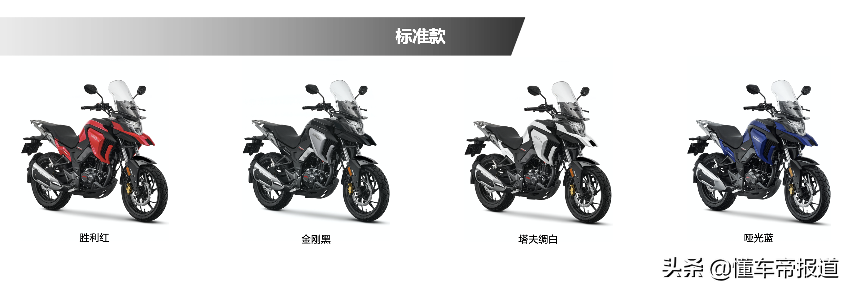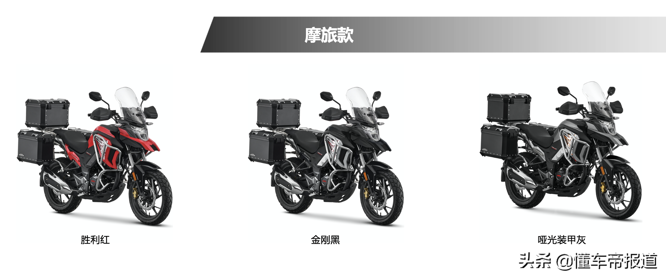在前部设计方面,新车配备有两级手动可调挡风罩、具备时钟显示功能的液晶仪表盘和一个外置USB接口。作为一大升级,新车轮胎也由此前的公路胎升级为全地形胎。据悉,新车外观配色也提供更多选装,其中标准款为四种、摩旅款为三种。